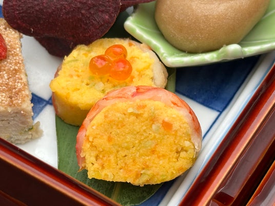 海老の赤、卵黄の黄色、枝豆の緑、人参のオレンジ色が美しく、料理に彩りを添えます。カットすると、枝豆と人参の断面が現れ、さらに華やかさを演出します。