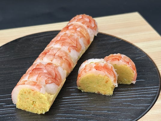 「海老野菜黄身寿司」は、彩り鮮やかな見た目と、解凍するだけで手軽にお使いいただける点が特長の商品です。すり身ベースのシンプルな味付けながらも、海老の旨みをしっかりと感じられる高級感のある味わいに仕上げました。