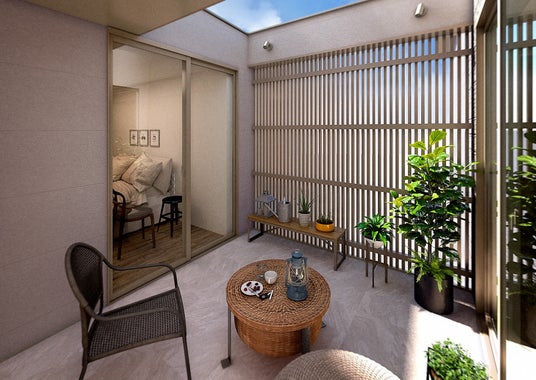 周囲の視線を遮りつつ外気を感じられるプライベートテラスを配置。日常の中でリラックスできる屋外空間を提案します。
