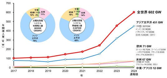 図 1 世界における地域別太陽光発電システム年間導入量推移および累積導入量(2024年)