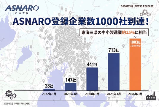 株式会社丸菱製作所(本社:愛知県春日井市、代表取締役:戸松 裕登、以下「丸菱製作所」)が提供する製造業受発注プラットフォーム「ASNARO(アスナロ)」は、このたび会員企業登録数1,000社を達成しました。事業開始当初から目標としていた2026年までの到達ラインを計画通り実現し、中小製造業が地域や既存の取引関係を超えてつながる受発注インフラとして、着実に利用基盤を広げています。