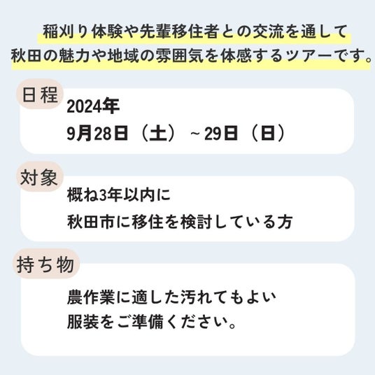 秋田市では、これから移住を検討している県外在住の方を対象として、稲刈り体験や先輩移住者・農家の皆さんとの交流を通して、秋田市の暮らしや魅力を体験していただくツアーを開催します。
