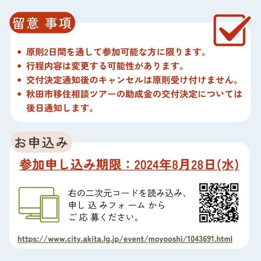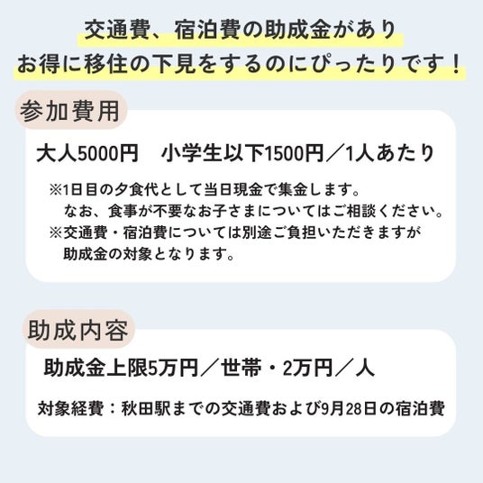 助成金・参加費用 本ツアーは「秋田市移住相談ツアー助成金」の対象です。交通費、宿泊費については別途ご負担いただきますが、助成金の対象となります。