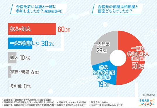 合宿免許には約6割の方が友人・知人と参加しており、一緒に参加した人や他の合宿参加者と相部屋で過ごした方が約7割でした。