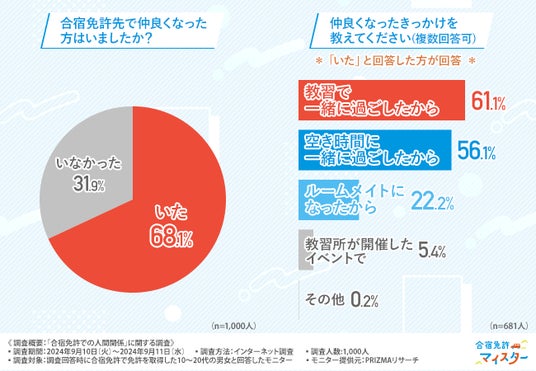 次に、「合宿免許先で仲良くなった方はいましたか?」と質問したところ、約7割の方が『いた(68.1%)』と回答しました。