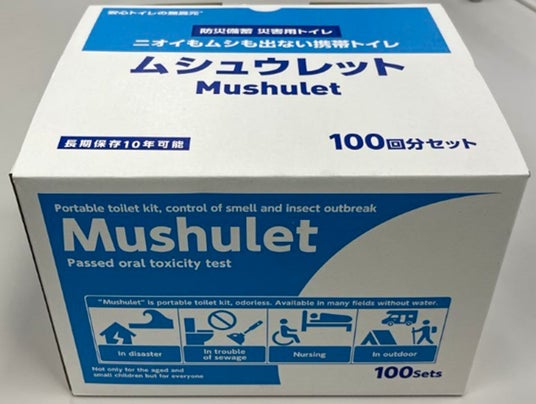 大館市では、災害備蓄用に採用いただいている当社の携帯トイレ「ムシュウレット」のうち、個包装タイプ『ムシュウレット・1(ワン)』 を、市民向け配布物の一部としてご活用いただきました。