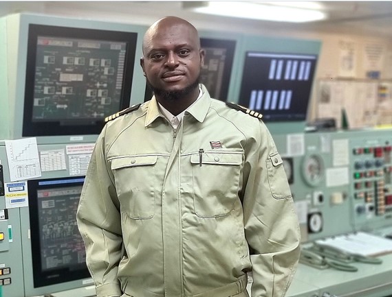 同氏は2007年から当社グループが運航しているLNG船に機関士として乗務経験を積み、現在は初のナイジェリア人機関長として実務についています。