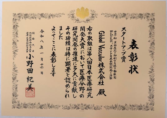 Global Vascular株式会社(本社:東京都千代田区、代表取締役CEO:尾藤健太、代表取締役CTO:前川駿人)は、「世界初 異物反応を抑制する膝下動脈用BioStealth(TM)ステントの日米承認開発と治験」に関し、内閣官房 健康医療戦略推進本部「第8回日本医療研究開発大賞」のスタートアップ賞を受賞しました。