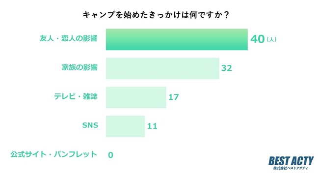 アウトドアメディア「TACKLE NOTE(https://tacklenote.com/columns/)」を運営する株式会社ベストアクティ(https://tacklenote.com)は、10代から60代までの100名に【キャンプを始めたきっかけ】についてアンケートを行いました。