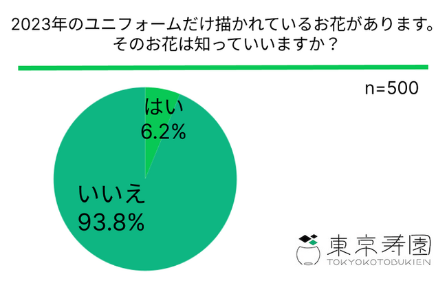 「2023年のユニフォームだけ描かれているお花があります。そのお花は知っていいますか?」という質問に、「はい」と回答した方は6.2%、「いいえ」と回答した方は93.8%という結果になりました。