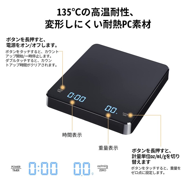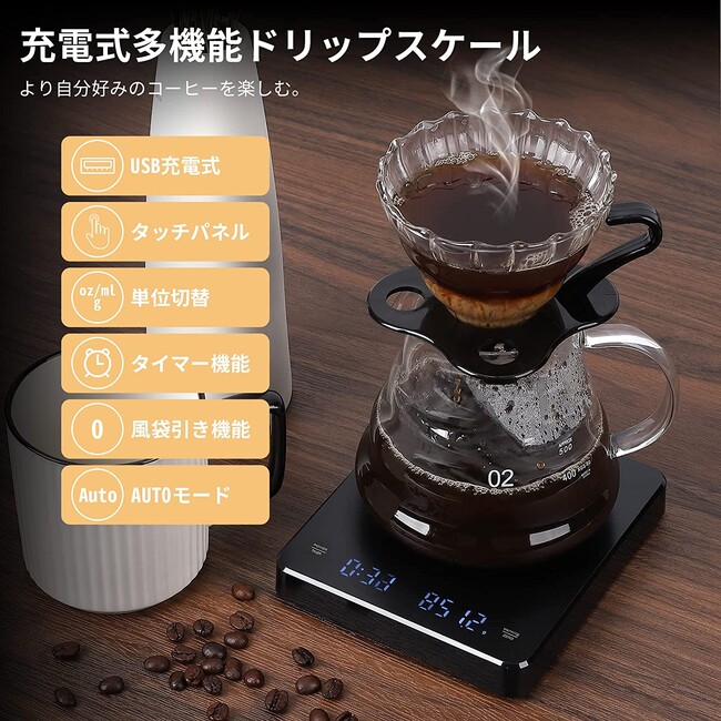 Litakeのコーヒースケールは、0.1g単位の高精度計量とタイマー機能が備わった便利なデジタルスケールです。豆の量や抽出時間を正確に計測し、自分好みのコーヒーを楽しむことができます。USB充電式で省エネ性も高く、軽量設計と見やすいディスプレイも魅力です。さらに防水性や日本語説明書の付属など、安心の要素も兼ね備えています。Litakeコーヒースケールでプロのようなコーヒーエクスペリエンスを実現しましょう!