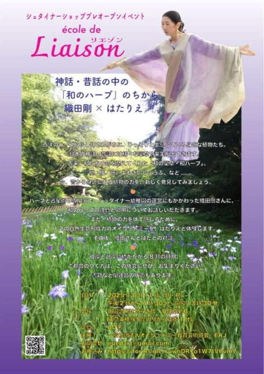 2025年8月11日(月・祝)、田園調布せせらぎ館にて、シュタイナーショップ「ecole de Liaison リエゾン」のプレオープンイベントとして、特別イベント『神話・昔話の中の「和のハーブ」のちから』が開催されました。植物力研究家の織田剛氏と、オイリュトミー芸術家のはたりえ氏(代表理事:はたりえこ)が登壇しました。