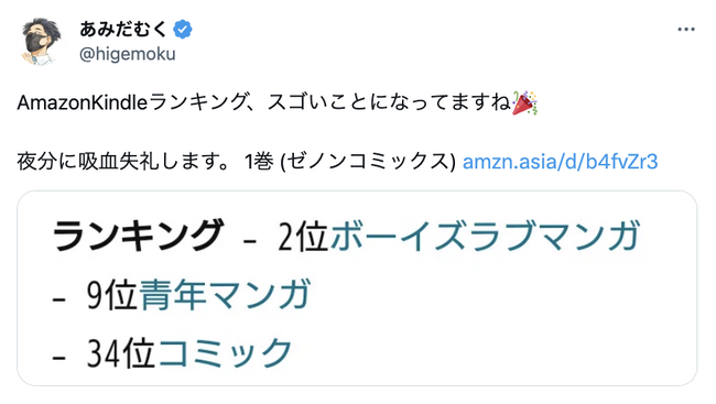 現在、ゼノンコミックス『夜分に吸血失礼します。』がKindleボーイズラブマンガ部門第2位に!!