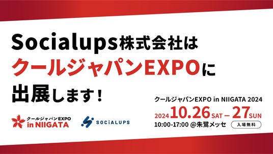 Socialups株式会社(本社:新潟市中央区、代表取締役社長:高瀬章充)は、2024年10月26日(土)~27日(日)に朱鷺メッセで開催される「クールジャパンEXPO in NIIGATA 2024」に出展します。