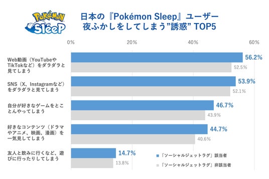 また、同じくソーシャルジェットラグ該当者からは、夜ふかしをしてしまう誘惑として「Web動画(YouTubeやTikTokなど)をダラダラと見てしまう(56.2%)」「SNS(XやInstagramなど)をダラダラと見てしまう(53.9%)」などが挙がっていました。