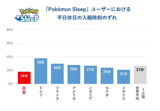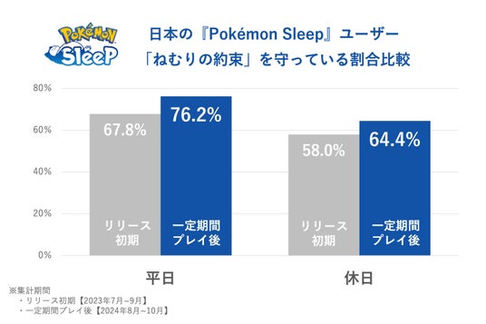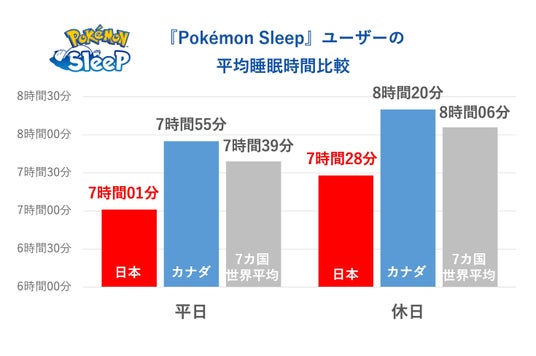 なお、『Pokemon Sleep』のリリース直後から現在までプレイしている日本人において、リリース直後3か月時点での平均睡眠時間は6時間55分であったのに対し、本調査の対象である直近3か月の平均睡眠時間は7時間26分であったことから、リリースからおよそ1年半で日本人の睡眠時間は約30分伸びていることもわかっています。