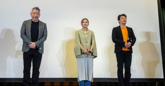 舞台挨拶の様子中尾浩之監督(左)佐々木ゆかさん(中央)、平野貴大さん(右)
