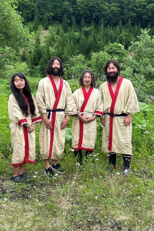 アイヌの衣装を着て仲間と記念写真。エキストラの衣装やメイクも細部にまでこだわっていることを知り、ワンシーンにかける手間と時間にとても驚いたのだとか。