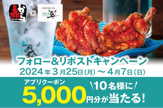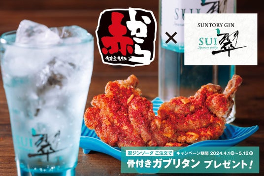 赤から×翠ジンのコラボキャンペーンでは期間中、翠ジンのドリンク【翠ジンソーダ、翠ジンジャー、翠緑茶割】をグループで1杯でもご注文いただくと「骨付きガブリタン」を1組につき1皿(2本)限定でプレゼントします。また、赤から公式Instagramにてフォロー&ハッシュタグ投稿すると翠(SUI)オリジナル「おそろいグラス」が抽選で50名に、赤から公式X(旧Twitter)でフォロー&リポストするとお店で使える「5,000円OFFクーポン」が抽選で10名に当たるプレゼント企画も同時開催します。旨みあふれる「骨付きガブリタン」とスッキリ爽やかな翠ジンの味わいをお楽しみください。