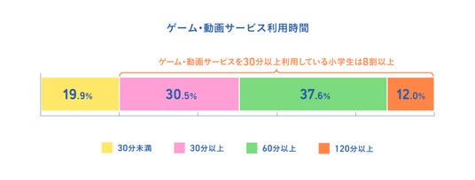 「ゲーム・動画サービスの利用時間」に目を向けると、日々30分以上利用している小学生は8割以上という結果になりました。その中でも1時間以上利用している回答が半数を占め、さらには2時間以上利用しているご家庭もおられる現状が見えてきました。
