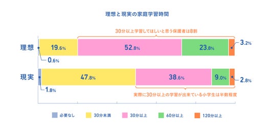 保護者が『理想』とする1日の家庭学習時間は、「30分~1時間」が52.8%で最多、30分以上学習してほしいと考える保護者は約8割、という結果となりました。一方、学習時間の『現実』は「30分未満」が半数を占め、理想と現実にはギャップがあるようです。