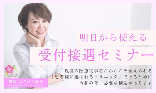 日本歯科心理カウンセラー協会は、歯科医院向けのセミオーダーメイド型の「受付接遇セミナー」をスタートいたします。医院の「顔」である受付の接遇はクリニックを左右する大きな存在です。しかし、現在歯科医院に特化した接遇は他に類を見ません。本セミナーでは、メディア出演経験のある日本初の歯科心理カウンセラーとして活躍しているおぎはら聡美より臨床経験と歯科心理に基づいた、「明日から使える受付・接遇」を医療従事者の視点からご紹介します。