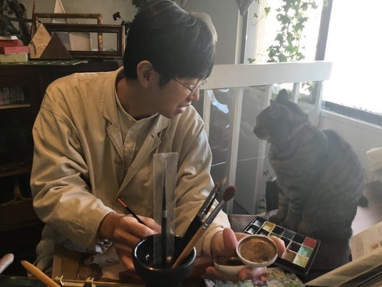 「混合技法」を用いた制作は、紙、板、キャンバス、硝子など様々な素材の支持体に、細い筆やペンを使い、点や線を重ねて描いていきます。職人のように非常に根気のいる作業ですが、一筆一筆何層にも塗り重ねられた質感は、様々な色の糸が何層にも重なった織物のようで「絵肌が光に当たる時、宝石のような質感や、時間の深みを感じさせる色を我々に見せてくれる」(宮崎)のです。