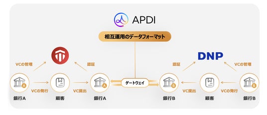 図2:Turing JapanとDNPがDIDおよびVerifiable Credentialsを活用し、APDIの標準フォーマットに合わせて連携することで国際銀行間のデジタル証明書の相互運用と安全性を実現