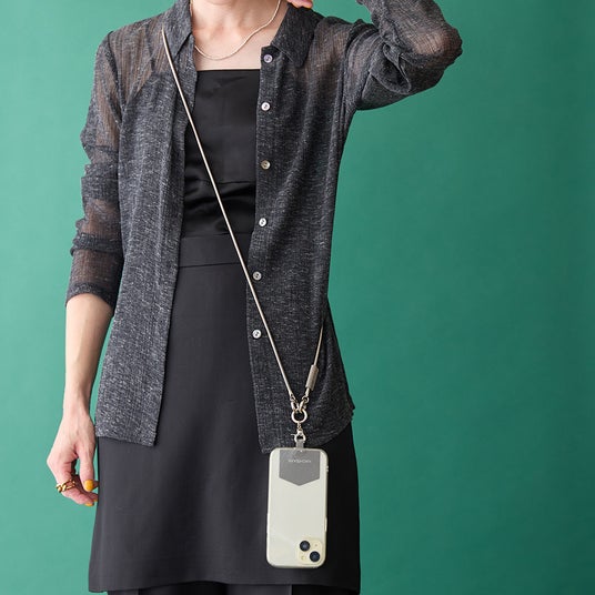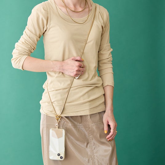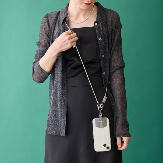 今回初登場した115cmタイプは身長163cmのモデルが着用した場合、腰骨上あたりにスマートフォンが下がる長さに。短めであることでもたつきが少なく、すっきりとした印象に仕上がりました。