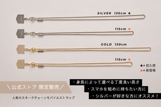 幅広いスタイリングに馴染む人気のスネークチェーンモバイルストラップに、新たにチェーンの長さが短くなった「115cm」バージョンが新登場。本日9月3日(火)より販売開始。