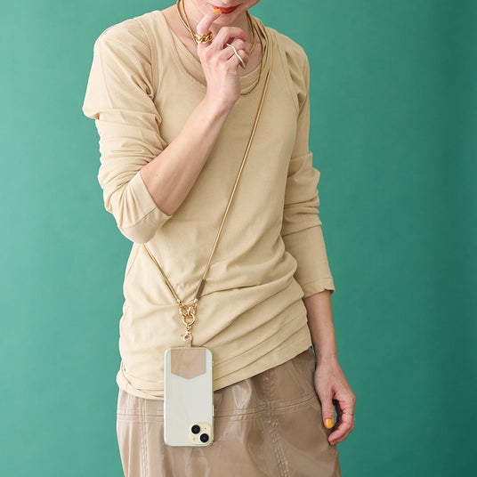 長めであることで、店頭でスマート決済をする際や電車の改札を通る際など、斜めがけで着用したままスムーズにスマホをタッチできることが利点です。