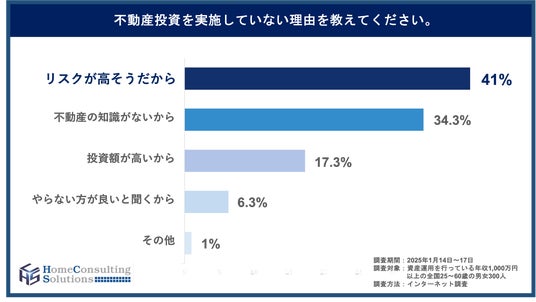 不動産コンサルとして20年以上、投資用不動産の市況を見てきたホームコンサルティングソリューションズ代表の小林大祐は、「数千万円~1億円近い借金をする不動産投資はそもそもリスクが大きい。購入後も空室リスクや設備故障のリスクなど金銭的な負担だけでなく、時間も手間もかかる。家族の状況やライフステージによって投資ができるタイミングは人ぞれぞれのため、誰しも気軽にチャレンジできるものではない。投資を検討している人でもこうしたリスクに対して正しく評価することが重要だ」と解説しています。また、「不動産の知識がないから(34.3%)」「投資額が高いから(17.3%)」などの回答も挙がりました。