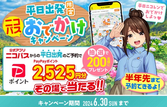 ニコニコレンタカー(運営:株式会社レンタス・店舗開発:株式会社MIC)は、2024年5月8日(水)から、平日の出発促進を目的とした新たなキャンペーンを開始しました。キャンペーン期間中にアプリ「ニコパス」で平日出発のレンタカーを予約してくれた方全員が対象!抽選で総勢200名様にPayPayポイント2,525円分をその場でプレゼントします!