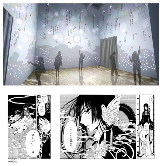 思わず口に出してしまう、語感のいい台詞。はじめて目にした瞬間から、心に染みわたる言葉。このエリアでは、CLAMPが紡いできた様々な「言葉」の力にフォーカスします。一つ目の部屋では、『xxxHOLiC』本編の漫画原稿を約40点展示。読む人すべてが心揺さぶられる珠玉の名句を厳選してご紹介します。また、二つ目の部屋は、CLAMP作品の独創的なフレーズの数々が散りばめられた空間となっています。この空間では「たった一つのCLAMPの言葉と出会う」体験型展示をお楽しみいただけます。