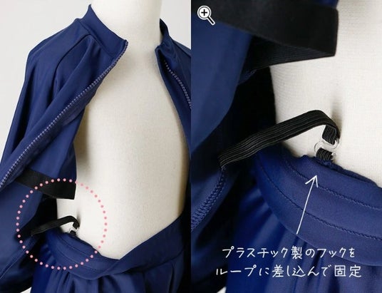 上下がわかれたセパレート型のスクール水着には、水中でのめくれ防止のためのストラップとフックがついていて、それらをつなぎとめることで水着のめくれを防ぐことができます。