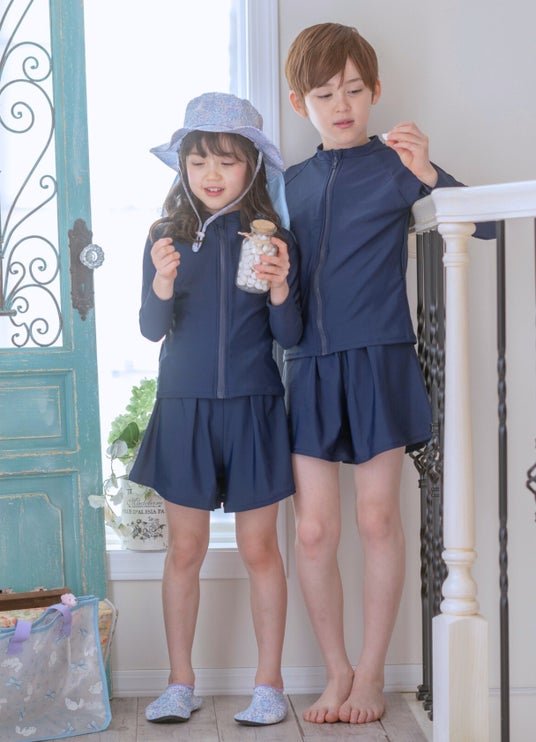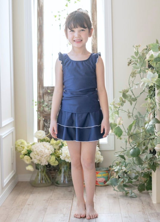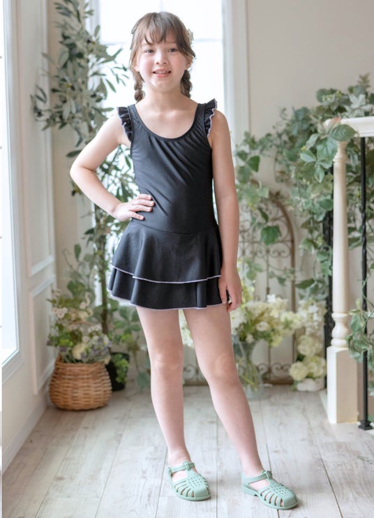 おしゃれな【フレンチスリーブデザイン】と、ガーリーな【肩フリルデザイン】の2タイプご用意。水着に抵抗があるお年頃の女の子でも、普段のお洋服感覚で着られるデザインです。