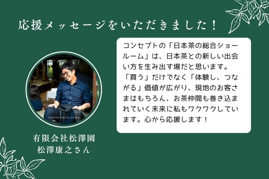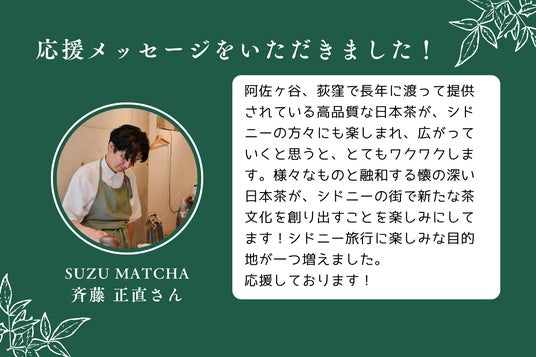 また、今回オープンするお店は、シドニー初の日本茶専門店となることから、多種多様な日本茶とその文化をご紹介する総合的なショールームとなることを目指しており、日本茶業界の皆さまからも、続々と応援メッセージをいただいております。