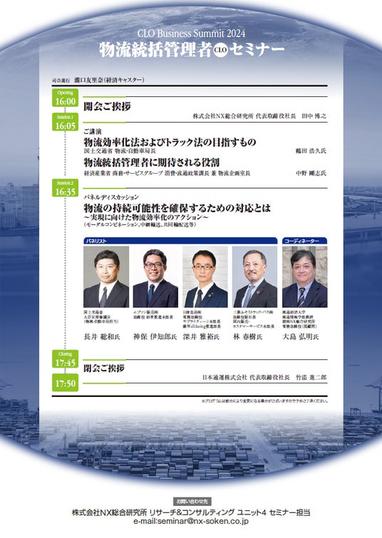 本年2月、一定規模以上の事業者を「特定事業者」に指定し、「物流統括管理者」(CLO)の選任や中長期計画作成の義務付けなどを盛り込んだ「流通業務の総合化及び効率化の促進に関する法律及び貨物自動車運送事業法の一部を改正する法律案」が閣議決定され、今後の法改正が見込まれています。本セミナーでは、このような情勢を踏まえて、国土交通省から鶴田浩久氏(物流・自動車局長)経済産業省からは中野剛志氏(商務・サービスグループ 消費・流通政策課長 兼 物流企画室長)をお迎えし、物流効率化法や、CLOに期待される役割などについて講演頂きます。また、日本を代表するからキーパーソンをお招きし、物流の持続可能性を確保するための具体的な対応についてパネルディスカッションを行います。物流の「2024年問題」における対応や、物流の効率化を検討されている方々は、是非ご参加ください。【開催概要】