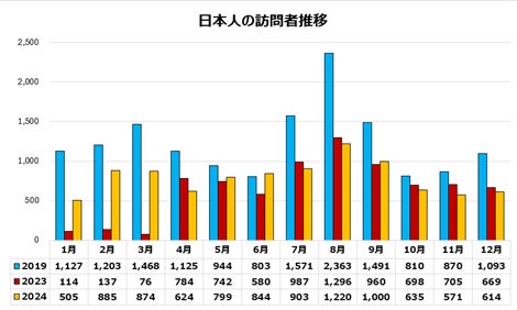 2019年、2023年、2024年の月別の日本人訪問者推移