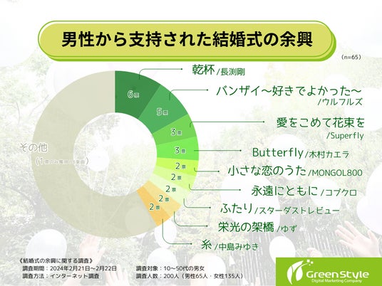 幅広い年齢層を対象に、「男性」という括りでアンケートを集計したところ、第一位を飾ったのは、長渕剛の『乾杯』。時を越えて結婚式の定番として歌い継がれる楽曲が、6票を集め堂々のトップを獲得しています。