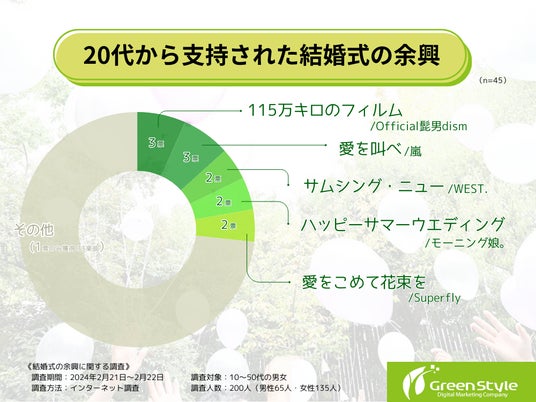 結婚式の余興ソングにふさわしい作品を探るべく10代から50代まで、幅広い年齢層を対象にアンケートを実施しました。