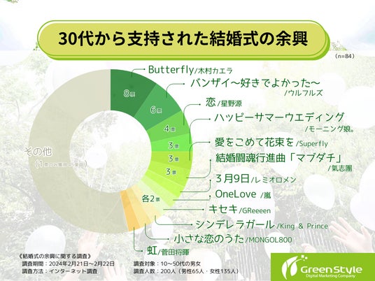 同様にモー娘。『ハッピーサマーウエディング』やGReeeeN『キセキ』、MONGOL800『小さな恋のうた』など、新郎新婦が人生の端々で聴いた思い出の楽曲が、人気を集めている印象です。卒業ソングとしても人気のあるレミオロメン『3月9日』がランクインするあたり、20代よりも「懐かしさ」を求めているのかもしれませんね。