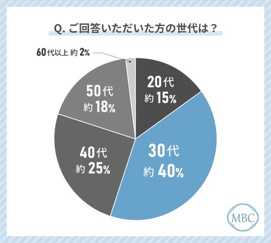 「回答者の年齢をお答えください」とアンケート調査した結果、20代(15%)、30代(40%)、40代(25%)、50代(18%)、60代(2%)でした。