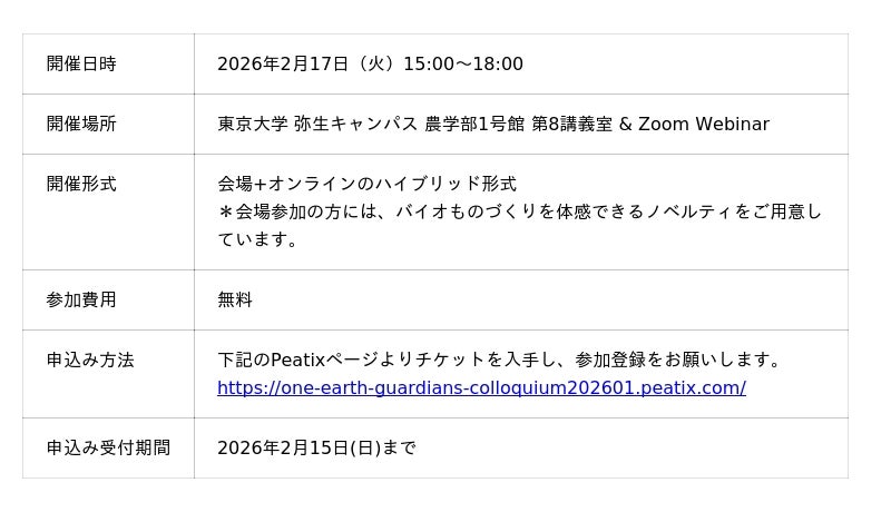 東京大学 大学院農学生命科学研究科 One Earth Guardians 育成機構(機構長:東原和成、東京都文京区)は、2月17日(火)に公開シンポジウム「バイオものづくりで次世代産業をひらく」を開催いたします。