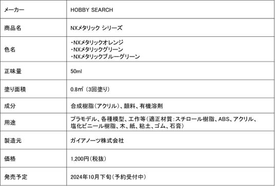 株式会社ホビーサーチ(東京都墨田区 代表取締役社長:川畑 泰史)は、自社オリジナル塗料「NX メタリック シリーズ第2弾」を2024年10月下旬に発売いたします。3色のカラーバリエーション「NX メタリックオレンジ」 「NX メタリックグリーン」「NX メタリックブルーグリーン」を第2弾として展開いたします。