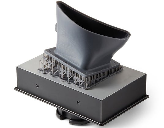 写真は、Greyレジンで造形した大型エアフロー検証用スナウト。Form4で2時間56分で完成しました(Form3+で9時間)