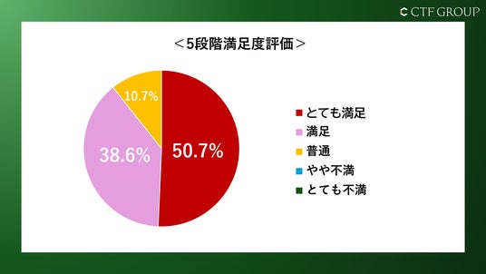 5段階評価(とても満足、満足、普通、やや不満、とても不満)で、全体の約90%が満足と回答しており、労働環境への高い評価が示されました。