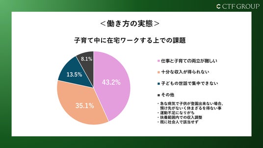 特に具体的な課題として、子どもの急病時の対応の難しさや、預け先の確保、収入調整の問題など、育児と仕事の両立に関する現実的な声が寄せられました。また、在宅ワークならではの課題として、運動不足を懸念する声も挙がっています。