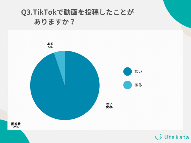 ショート動画SNSの運用やインフルエンサーキャスティングを行っている株式会社Utakata(https://utakata.co.jp/)は、10代~50代のTikTokユーザーの男女216名を対象に、「TikTokの利用状況」に関する調査を実施いたしましたのでお知らせいたします。