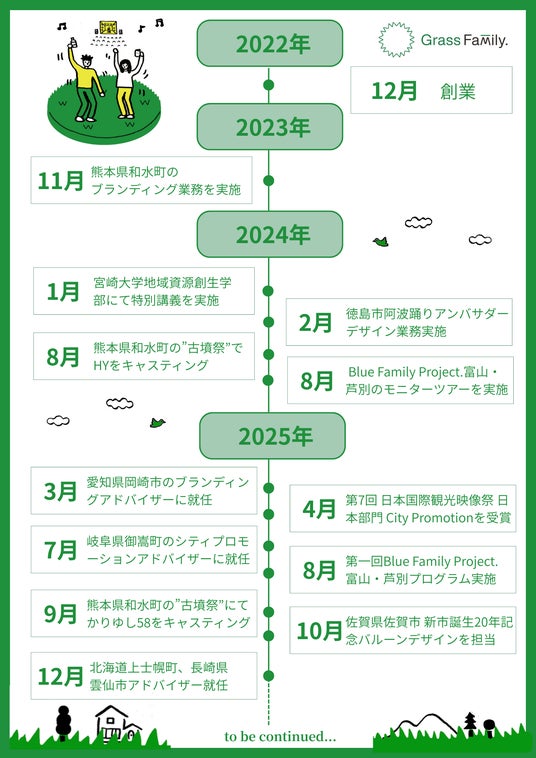 地域と人をつなぎ、次の時代に残る新しい価値をプロデュースする地域共創カンパニーの株式会社Grass Family.(本社:神奈川県海老名市、代表:荻野 孝史、以下「Grass Family.」)は、2025年12月12日に創業3周年を迎えました。この節目を受け、Grass Family.がこの3年間で全国の自治体や地域とともに取り組んできた地域ブランディング、並びに原体験を起点とした関係人口創出の実践知をまとめた実績ガイドブックを公開いたします。あわせて、これまで大切にしてきた想いを言語化し直したMVV(ミッション・ビジョン・バリュー)をアップデートし、次のフェーズに向けた歩みを発信してまいります。